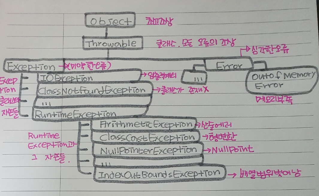 | 에러(error) | 프로그램 코드에 의해서 수습될 수 없는 심각한 오류 |