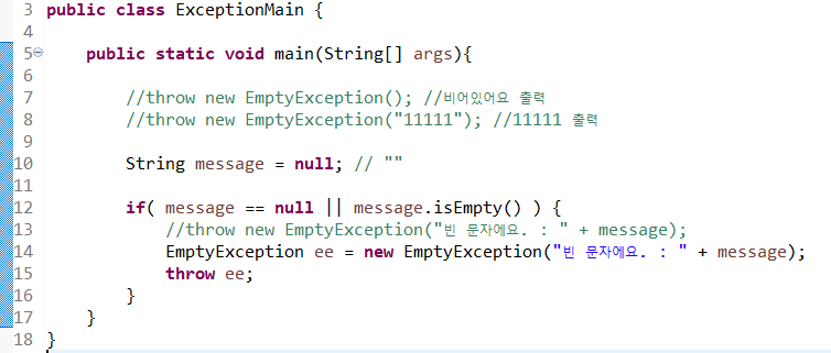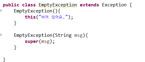 만일 , 아래와 같이 EmptyException 클래스를 extends RuntimeException 했을 경우에는 메인클래스에서 예외처리를 하지않아도 에러가 발생되지않습니다.