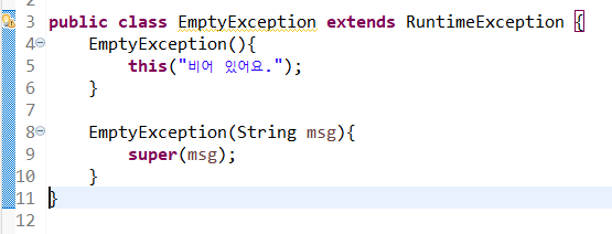 만일 , 아래와 같이 EmptyException 클래스를 extends RuntimeException 했을 경우에는 메인클래스에서 예외처리를 하지않아도 에러가 발생되지않습니다.