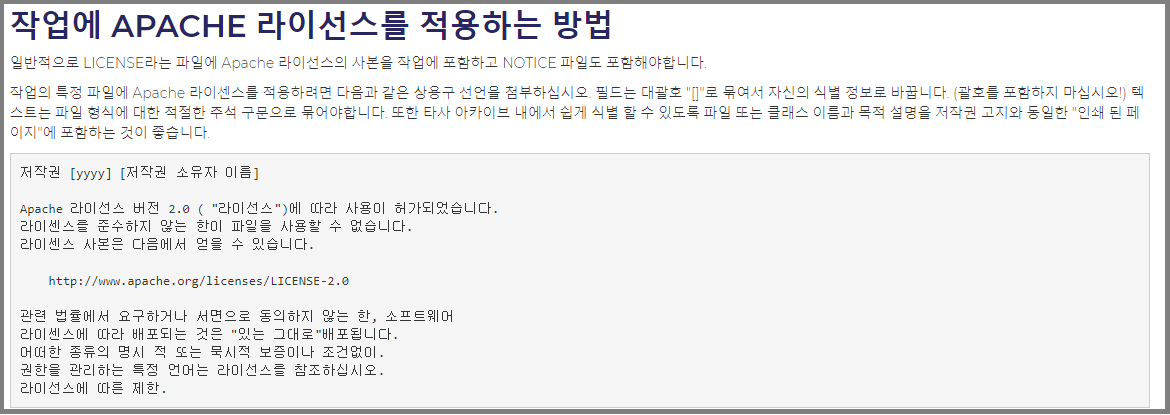 라이센스에 대한 내용 주소는 www.apache.org/licenses/LICENSE-2.0 입니다.