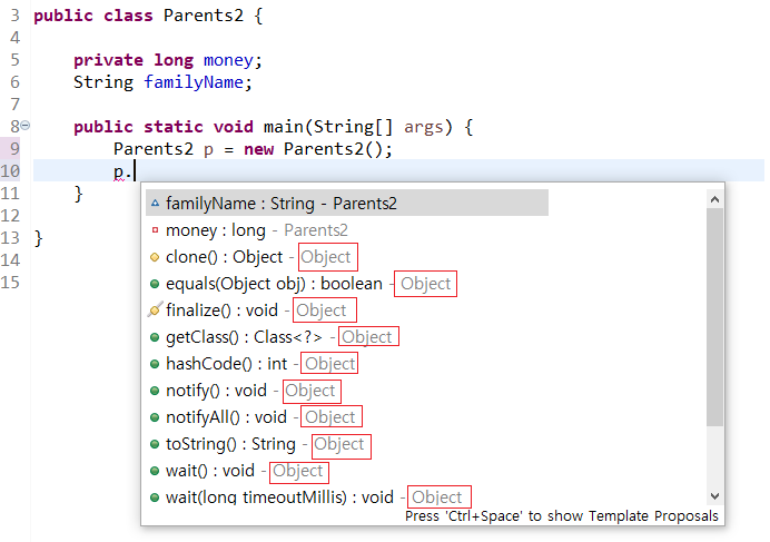 System.out.println(parents2.getMoney()); //어느 클래스를 기준으로 하더라도 가장 마지막에 오버라이딩된 메서드가 실행됩니다.