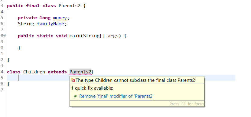 final이 붙은 Parents2클래스를 상속하려 하지만 아래와 같은 에러가 발생되며 상속되지않습니다.